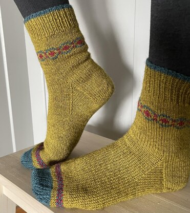 I made these pretty socks while I was on holiday in Scotland. The colours I chose exact an easy to wear country feel, while the pretty fairisle band adds a delicate feminine touch. (More importantly, the chequered band at the toe provides real interest when toasting your toes in front of the wood burner!)