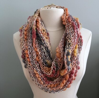 Universal yarn markets two beautifully textured yarn called Bamboo Bloom and Bamboo Bloom Handpaints. King Cole markets a similar yarn called Bamboozle. Both are thick to thin yarns in lovely colors. The changing textures and colors make it possible to create a one-of-a-kind stunning cowl.