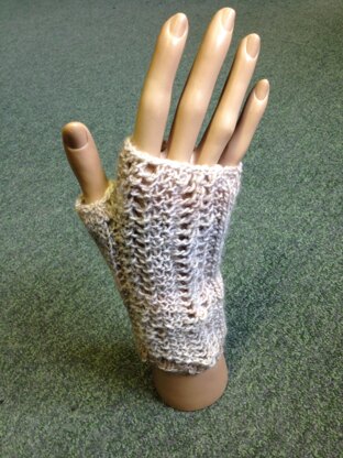 This is a knitting pattern for a pair of fingerless gloves. It is knitted in the round with DK yarn.