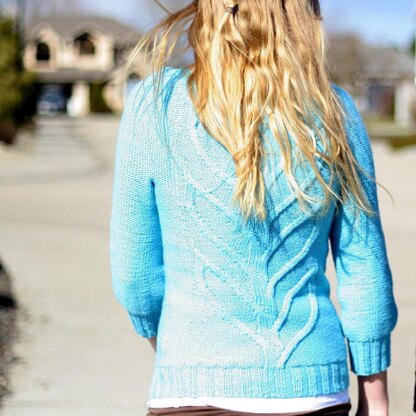 A simple seamless sweater with a tree motif on the front and back. The sizes are: 30 (34, 38, 42, 46, 50) inch bust, and there is no ease. They need 7 (8, 9, 10, 11, 12) balls of swish. This sweater is not suitable for making longer or shorter, unless you are ready to do all the adjusting in the ribbing, or change the whole cabled tree! On the other hand, the plain sides make it simple to add in waist shaping if you want it. It is knit in the round from the bottom up, and uses grafting in the underarm.