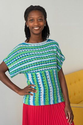 This quick knit is destined to be your summertime favorite. The base section is worked from side to side. Once the base is blocked, stitches are picked up to knit the top section from the bottom up.
