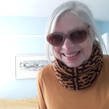 The cowl starts with a provisional cast on. The colourwork and stripes are knit in the round and finished with a grafted seam to produce a supremely cosy double thickness, single loop cowl. Links to helpful videos are provided. This could be a good project if you are learning to manage two strands of yarn as there are no single stitches and the pattern repeat is relatively straightforward. There are some longer floats but these are hidden within the tube of the cowl and do not need catching.
