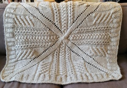 Knit in the round from the center out, this cabled cozy, a veritable sampler of unusual cables and broken rib edging, measures just over 38” x 38” and is the perfect size and weight for getting cuddly on the couch! Worked in a super-bulky acrylic (approx. 750 yards used), this knits up fast, is washable and light-weight. Charted and written directions included!