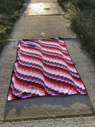 The 3D-looking wave is created by keeping the height of each row the same (by using the dc block) but changing the width of each column (by increasing and decreasing the number of stitches). It is worked corner to corner, right to left.