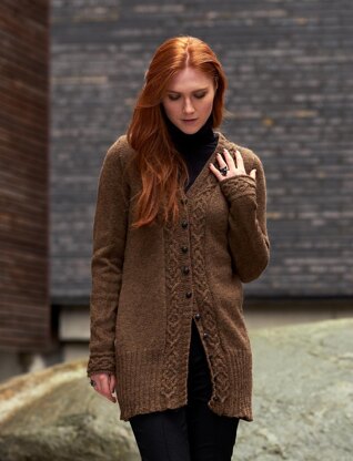 Elaborate spear cables run like a spine on the back of this long jacket before they are moved towards the shoulder at the top. At the front one cable follow the line along the v-neck. The sleeve has a spear cable running around it at the bottom, before the upper part is knitted in the round in stockinette stitch. The a-line cardigan is named Barra – Celtic for spear.