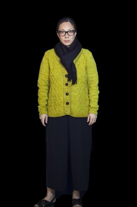 A great Fall cardigan with cabled fronts and back and a cozy shawl collar, and simple stockinette sleeves.