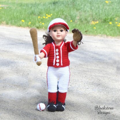 This Baseball / Softball Uniform fits 18” dolls. The pattern includes a Jersey, Pants, Socks, Cleats, Hat, Bat, Ball, and Glove.