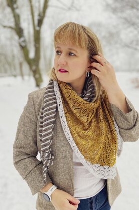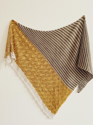 This simple but stylish shawl is engaging and rhythmic to knit, and easy and fun to wear. Most of the body is worked in striped Garter stitch. The final section of simple lace engages the mind and draws the eye.