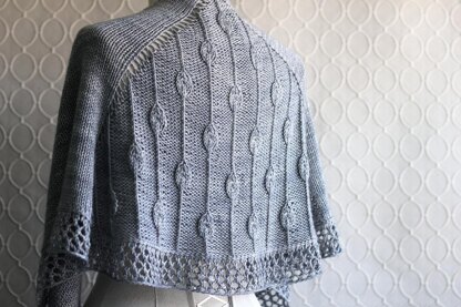 The shawl is worked from the top down, beginning with a garter tab cast-on, and features a distinctive twisted stitch pattern, a hint of lace at the bottom edge and a unique lateral braid technique where the lace and the body of the shawl intersect.