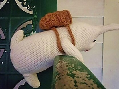 Basket Bunnies are knit in one piece from the bottom up to the tip of the ears. Arms, feet, and tail are knitted separately and seamed on. A little basket knit in simple basket-weave stitch with i-cord straps wraps around each of the bunny's arms. Finished bunny is about 11 inches tall.