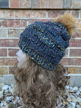 This Basketweave Hat is loom knit on a 3/4” gauge, 40-peg round loom. The Knitting Board's Adjustable Multi-Knit loom was used for the sample. This hat uses approximately 80 yards of a [6] super bulky yarn. Lion Brand’s Wool Ease Thick & Quick, 80% acrylic/20% wool, in the Bedrock colorway was used in the sample. This warm hat is easy to knit and can be created in no time at all! The pattern is suitable for a beginner loom knitter.