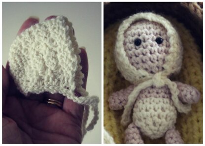 Pattern includes instructions to make... Bassinet (approx. 7" x 5") & mattress insert (5.5" x 3.5") Baby: approx. 4.5" long Baby Blanket: (approx. 5.5" x 4.5") Coordinating Baby Bonnet (If I create additional accessories in the future, I will send out free pattern updates.)