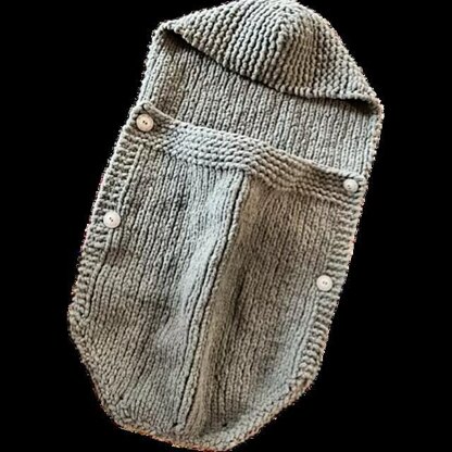 The Bassinet Sleeping Bag is a knitted baby cocoon with buttons for easy access.