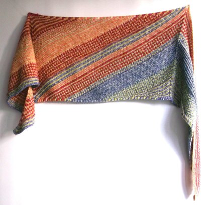This shawl starts life as two top down triangles worked with increases for length. They are then joined together using a three needle bind off to create a long rhomboid.