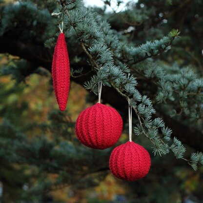 The pattern includes written instruction and chart (it is not necessary to read charts) for making cabled icicle and small and large baubles.
