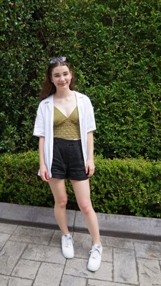 The top’s design is simple, composed of 2 cups and a waistband. The cups are made in a thick single crochet stitch, and the waistband uses a light, lacy pattern with great drape and breathability. It ties up at the back and is very easily adjustable.