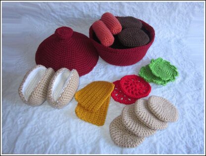 You will need… All yarn used is Red Heart Super Saver Solids Burgundy or desired bbq color Black for bbq Buff for hamburger and hot dog buns Brown for burger patties Coral for hot dogs Gold for cheese Cherry Red for tomatoes Spring Green for lettuce White for inside of hot dog bun Fiber fill stuffing Clean cereal box or other thin cardboard Yarn Needle Size D 3.25mm or desired crochet hook Stitch Markers