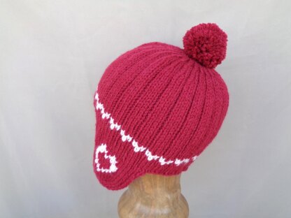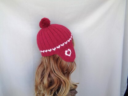 This cozy earflap hat has a sweet heart knit into the earflap, and a heart pattern around the brim. Perfect for anyone who needs a little extra love in their life!