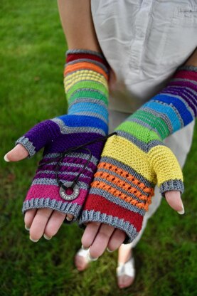 The Mothy and the Squid miniskein set used for these mitts was a luxury of riches – how to design an accessory that showed off the fully glory of the color range and still give knitters a chance to play in the process? As if the colors weren’t enough, I decided to “go big or go home” and make these fully elbow-length. There’s nothing shy or boring about these mitts, and I envision them serving as a powerful uniform for anyone who needs motivation to get things done or face what’s coming. Be bold. Be colorful. Be relentless.