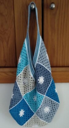 The Beach Blues Bag is a lovely slouchy bag, perfect for beach or shopping. It is made of squares which are joined and a single strap handle is formed from the top.