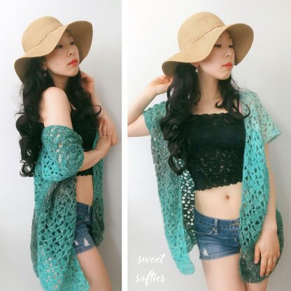 The Beach Breeze Kimono Top is a short-sleeved cardigan that is perfect for the warmer Spring and Summer seasons! It works beautifully as a lacy swimsuit cover-up. You can also wear it as a light shrug over a casual tank and shorts, or pair it with a summer dress! The finishing directions also allows for an alternative “poncho” (pullover top or tunic) style with open sides with seamed front and back pieces.