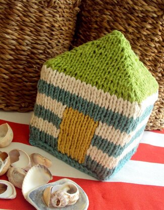 A fun doorstop in cotton dk used double. The sides are striped, and the door is knitted in intarsia. the roof is shaped to size. Anyone new to intarsia will be able to do this simple project. Inside, a cardboard version of the doorstop is filled with pearl barley. Measurements 15 cm wide x 20 cm deep. Part of a range of knits for the home inspired by the seaside. Also available in a create Space boo on Amazon A Day at the Seaside, paperback and kindle.