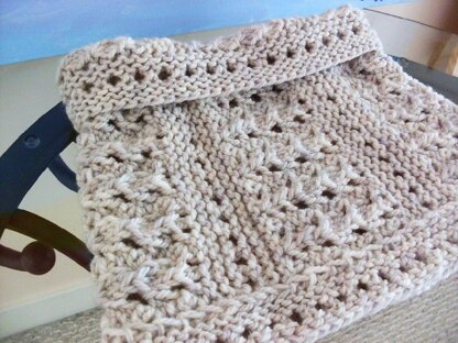Beach Peas Cowl pattern is designed as a part of a set with a matching hat. Stitch patterns used in this design make it perfect for a reversible accessory like this cowl. The main part of the cowl is worked flat, then the ends of a knitted piece are grafted together for a seamless look. Finally, the trims are knitted on in the round from picked up stitches. The different number of picked up stitches at the top and bottom of the cowl creates an A-line shape for a comfortable fit.