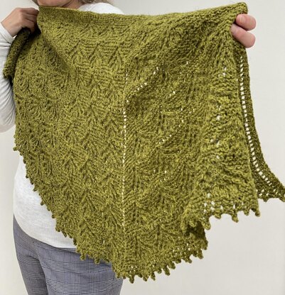 The shawl is constructed top down, with rectangular centre section and two outer triangular wings. Stitches are increased at the outer edges and on either side of the centre panel. The top border is knitted in garter stitch and the undulating picot cast-off edge is made with different sizes of points, reminiscent of the Seaweed fronds.