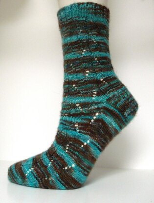 Lazy waves run up and down these socks knit up in beach inspired yarn dyed up by Sugarbee Studios. Paired yarnovers and slanted decreases make the lines wave back and forth to make the most of variegated yarn. You can always check yourself on this easy to memorize pattern by making sure the purl columns line up! Pay attention when you get to the heel flap to make sure you are working the correct version of the beachcomber lace. Instructions are written for magic loop, but this can easily be worked on dpns as well.