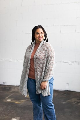 The Beaconsfield shawl is a wide rectangular wrap in three sizes, worked flat from the short end. The shawl begins and ends with several repeats of Horseshoe Lace pattern, transitioning to English Crystal Lace in the middle for the majority of the shawl.