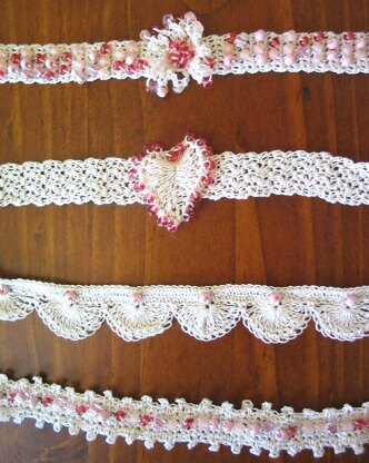 4 lovely beaded chokers in one pattern! The heart, flower, picot, and shell chokers sport pretty beads that are strung on the thread and then placed as the choker is crocheted. All chokers tie closed at the back of the neck. Finished size varies from 21-23" including tie closures.