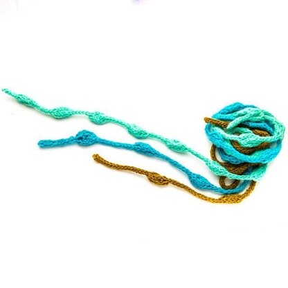 I often wear skinny headbands, and I was brooding over what you could do to make an interesting stitch pattern in I-cord. Beads! The pattern includes (and shows) three variations, but you can let your imagination go wild and change it up however you want. Consider the pattern a starting point.
