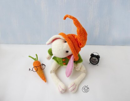 Materials needed : • 4 double-pointed needles in a size suitable for the yarn weight you are using. I recommend using needles a size or two smaller than the yarn calls for, to produce a firm fabric. Needles size 2 (3mm) for the bunny, size 4 (3,5mm) for jacket and carrot • White, pink and orange yarn Special Stylecraft DK color White (1001), color Jaffa (1256), color Candyfloss (1130) (100% acrylic 304 meters / 100 grams) • Green yarn Cascade 220 Fingering color Jasmine Green (9623) (100% Wool, Fingering 250 meters / 1.8oz) for the jacket • Plastic eyes or 2 buttons for eyes • 4 beads diameter 20 mm • Toy stuffing • Yarn needle • Stitch holder • 3 or 4 buttons • Glasses