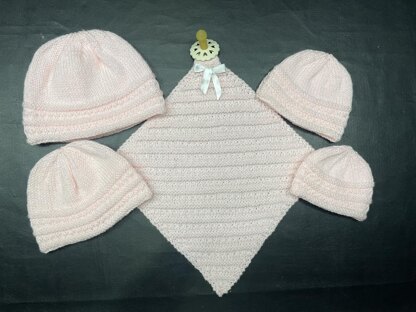 The Beanie & Pacifier Blanket Set is an intermediate level knitting pattern but could also be perfect for the motivated beginner knitter. The pattern consists of knit, purl, knit together and knit front and back stitches, video links provided for additional guidance if needed.