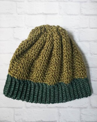 This textured beanie uses a simple, repetitive stitch combination to create a twist.