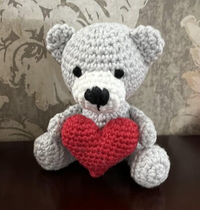 This crochet pattern makes up my little bear design (approx. 11cm by 6cm plus arms and legs) holding a detachable love heart (5cm x 5cm), held in place with small magnets. It's fairly easy with simple stitches but there is some sewing.