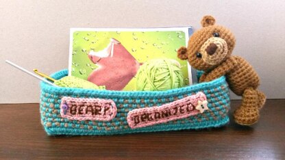 Is your desk also always full of those tiny things you don’t know where to put but which are great to have at hand? Paper clips, pencils, notecards, stitch markers, crochet hooks? Well, mine definitely is, and because I wanted a nice place to store them all in, I came up with this basket idea. I wouldn’t be myself, if I didn’t add a cute factor, though, so the basket comes with a cute teddy bear to guard your stuff and help you keep your desk beary organized!