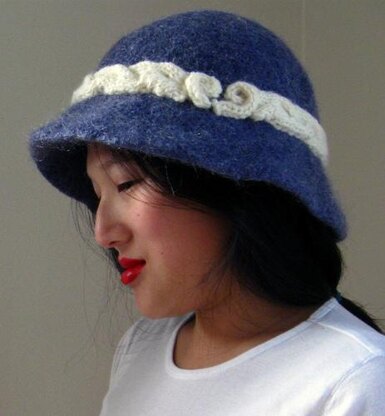 Beatrice is a felted bucket hat with a plait cabled hat band. The hat is worked from the top-down and is felted to size. The cabled band is hand sewn on after felting and takes a small amount of worsted weight yarn. Both written and charted instructions are included for the band.