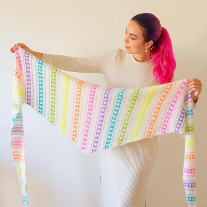 This shawl was dreamed up as an ode to bright and adventurous yarn colors shown over a mellow background. The pattern could work well with one skein of variegated or ombre yarn used for a contrast color as well as a set of mini skeins. Or maybe dive into your stash and get a whole lot of yarn leftovers and scraps to use for each stripe!