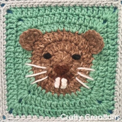 This beaver granny square is approximately 15 cm x 15 cm (6" x 6"), and can be used as a component for crocheted items such as a blanket or cushion cover. The square can be used repeatedly, or with others.