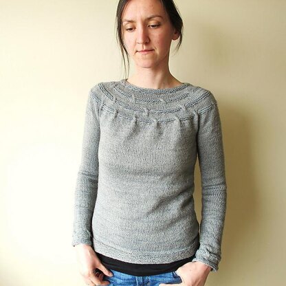 This ladies’ pullover is worked from the top down in one piece, in the round. Short rows are worked to shape the neckline; the sleeves and body are worked in the round.