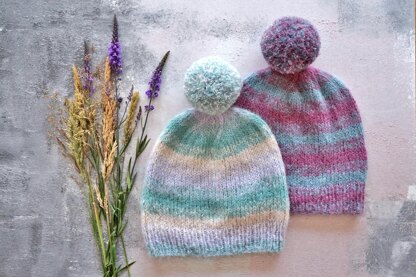 Knitted with two or three colours of Fyberspates Cumulus, the Becloud Hat uses two strands of Cumulus held together to create an ombre effect. Using Cumulus doubled makes the most gorgeous soft, warm, lightweight fabric with a lovely drape (ideal for a hat with just the right amount of slouch) and it also makes awesome pompoms so we couldn’t resist adding one to the top of these hats!