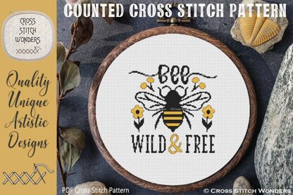 BEE WILD & FREE.\n\nA "BEE" saying that speaks for itself and an easy stitch up too!\n\nMarcia Manning designed this from licensed artwork.\n\nDesign is 98 stitches wide by 99 stitches high.\n\nSize 11 count: 8.91 x 9.00 inches or 22.63 x 22.86 cm\nSize 14 count: 7.00 x 7.07 inches or 17.78 x 17.96 cm\nSize 16 count: 6.13 x 6.19 inches or 15.56 x 15.72 cm\nSize 18 count: 5.44 x 5.50 inches or 13.83 x 13.97 cm\nSize 22 count: 4.45 x 4.50 inches or 11.31 x 11.43 cm