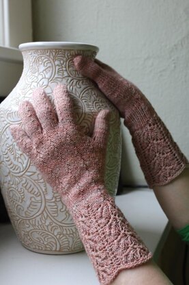 The Beechbone Gauntlets are a study in contrasts. Worked in the round, each begins at the Beech Leaf Lace patterned cuff and transition to 1/1 rib at the inside wrist for snug fit. At the onset of the rib the herringbone pattern begins at the back of the hand, continues as the thumb gusset and palm are worked in Stockinette stitch, and carries on to the rem of the hand. Then the fingers are worked in St st palmside and herringbone continues on the public side. The thumb is worked entirely in St st. Fingers and thumbs are worked in the round on dpn.