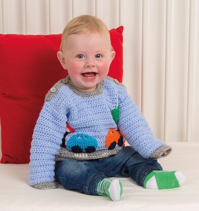 Amazing crochet baby sweater features appliqué motifs for little ones who are mad about all things car.