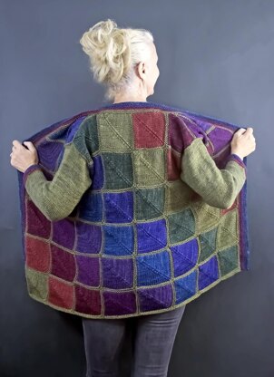Fresh off the needles, The Tetons was designed in the Tetons and finished there as well. look Miters squares show off Laura Bryant's New colors Symphony Chroma Noir many colors to choose from You pick your colors, and Main, and or make it in two colors...Same amount of yarns. Done in one piece up to the armholes, then you separate fronts, and back and continue with the color scheme. Sleeves are done in the Main color with the cuff accentuating the other colors. The band is done the same way. Easy to follow instructions with a schematic detailing each color and rows. If you desire a larger size (52) email me...