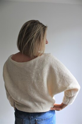 Throw on this easy knit sweater at any time of the year. The stylish batwing sleeves mean you'll stand out for all the right reasons. This simple sweater is knitted in two identical pieces with just stockinette stitch, you don't evn need to know how to increase or decrease so it is perfect for beginners.