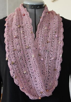 Crochet pattern for a Bejeweled Cowl that is like wearing a piece of jewelry! Festooned with beads, the cowl can be worked in one of three options: circle, mobius, or double twist. The beads are added to the yarn and then rounds of varying stitches are worked to add interest and beads pulled up randomly on the back side of the round. A fun way to use up your bead collection!