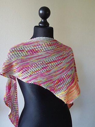 Here comes a pattern for a little shawl, showing the beauty of those single skeins of colorful handdyed yarn. Add scraps in matching or contrasting colors for some extra fun.