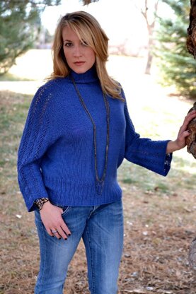 This beautiful garment has long raglan shaping for the sleeves almost dolman/batwing like. The delicate lace on the sleeves adds a visual punch to this sumptuous merino and silk yarn.